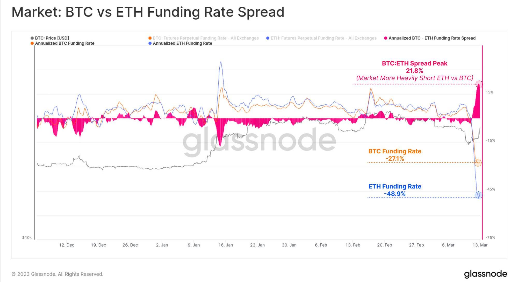 在这次反弹之前,永续掉期市场的融资利率进入了极端的现货溢价水平。交易员分别支付-27.1%和-48.9%的年化资金利率来做空BTC和ETH。交易员做空ETH的力度也大得多,BTC:ETH的价差达到21.8%,这是自FTX抛售以来的最大水平。