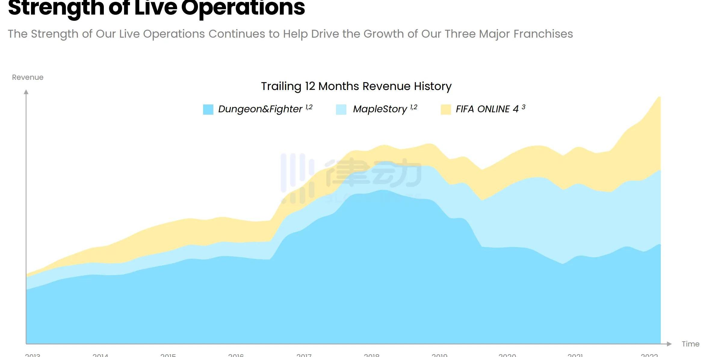「冒险岛」与「DNF」和「FIFAONLINE4」是当前NEXON的「三驾马车」截止到2022年第4季度,「冒险岛」在全球范围内有超过1.8亿的注册玩家,总收入超过40亿美元。相比于2021年,「冒险岛」2022年的全年收入增长了62亿日元。