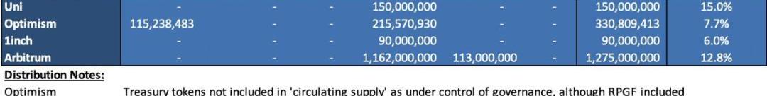 $ARB空投百分比略高。团队+投资者的分配比$UNI和$OP高,但低于$1INCH国库的分配与同行持平完整表格: