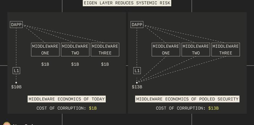 鉴于ETH质押者在验证其他网络时不会产生任何边际资本成本,再质押大大改善了质押者的可能性范围。EigenLayer确实伴随着一些杠杆和砍价风险,因为如果遇到恶意行为,相关的质押资产可能会在多个安全网络中被砍掉。每当相同的资本被用来验证一个以上的网络时,资产基础就会有内在的杠杆作用,使系统面临潜在的连带风险。