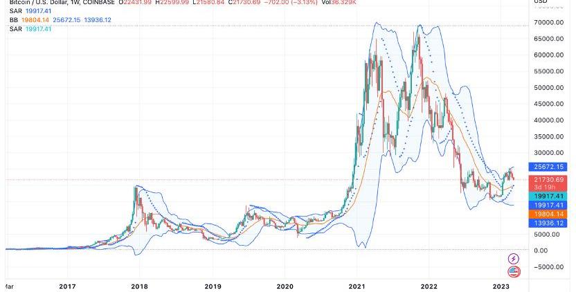 货币流动性趋紧。美联储主席鲍威尔鹰派发言,利率峰值可能高于预期,如有必要将提速加息。3月议息会议前的经济数据仍然坚挺,市场预期3月加息50个基点概率从30%提升到70%,并将利率峰值预期上调25个基点。但长期看,美股纳斯达克指数月线级别上涨,美元指数月线级别下跌,未来一年加密市场易涨难跌。