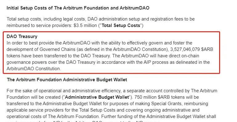 然而官方文档中同时介绍了ArbitrumDAO的相关章程,章程中详细描述了ArbitrumDAO治理架构以及治理流程。根据AIP-1提案,Arbitrum基金会为了向ArbitrumDAO提供有效治理和促进治理链发展的能力,已经将3,527,046,079枚ARB转移到DAO国库。而ArbitrumDAO将对DAO财政部拥有直接的链上治理权。