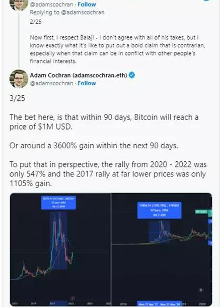 Cochran表示,Balaji的注是在加密市场进入寒冬之后,去年加密寒冬来临,当时价格暴跌,许多加密公司倒闭,之后该行业发展举步维艰,加密行业内的很多人失去了对未来的希望,所以人们“渴望行情好转”。他表示:“看到加密行业在如此危险的宏观环境中被不切实际的注所推动,很令人失望。”