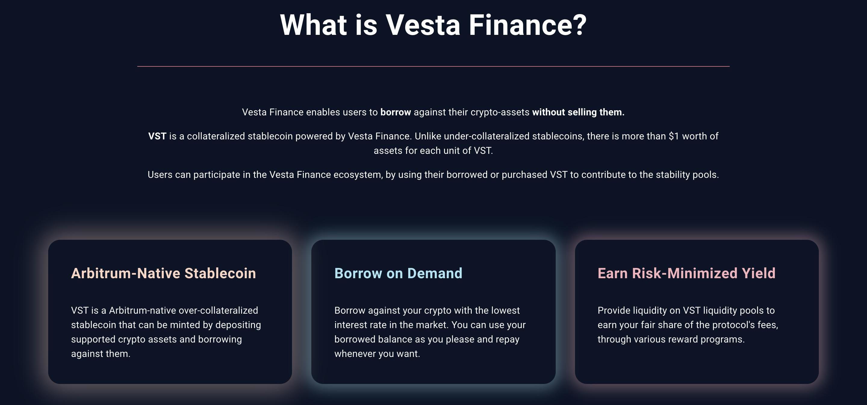 VestaFinance是一个借贷协议,现在也推出了自己的稳定币$VST。用户可以用ETH、gOHM、GMX、GLP或DPX借出$VST。