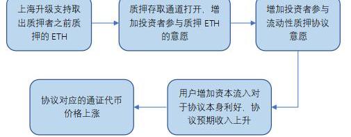 上海升级支持取出质押者之前质押的ETH,此时质押的存取通道将同时打开,这将增加用户质押ETH的意愿,根据当前的质押率15%来看还是很低的,所以预期还会有很大的上涨空间。那么显然用户将资产存入流动性质押协议的意愿也会增加,更多用户的使用更多资产的流入,对于协议本身是利好的,质押服务里约10%的稳赚利润将给到对应的服务商,其预期收益以及质押APY也将不断上升。在稳定良好的运作状态下,协议本身对应的通证代币的价格也将不断炒作上升。