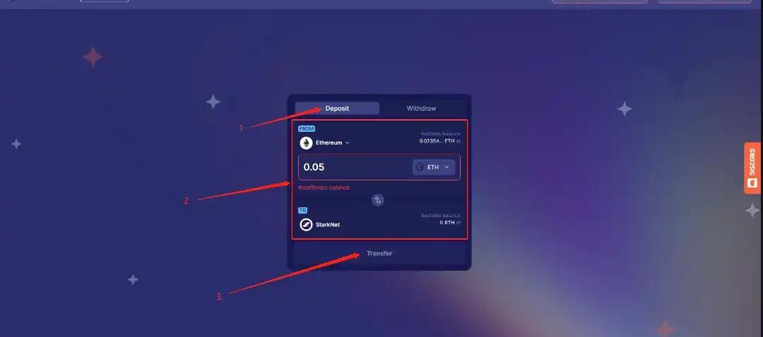 点击Deposit,输入存入的数量,点击transfer存入stark主网