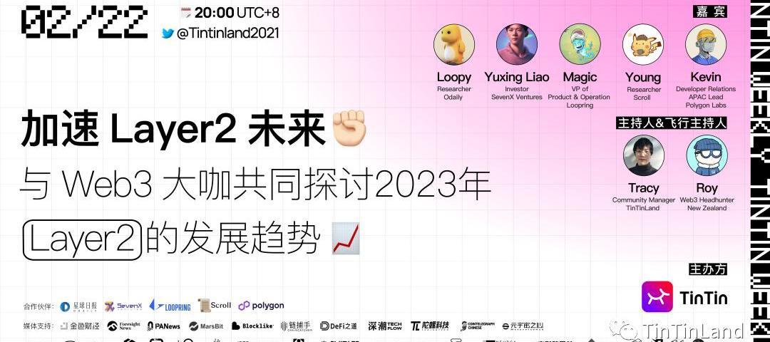 毫无疑问,随着年中以太坊新的升级的到来,Layer2将迎来发展的高峰,以“加速Layer2未来:与Web3大咖共同探讨2023年Layer2的发展趋势”为主题,TinTinWeekly栏目邀请到来自Loopring的Product&OperationMagic、星球日报研究员Loopy、Scroll研究员Young、PolygonLabsDeveloperRelationsAPACLead的Kevin、SevenXVentures的investorYuxingLiao一同讨论今年Layer2发展的机遇。