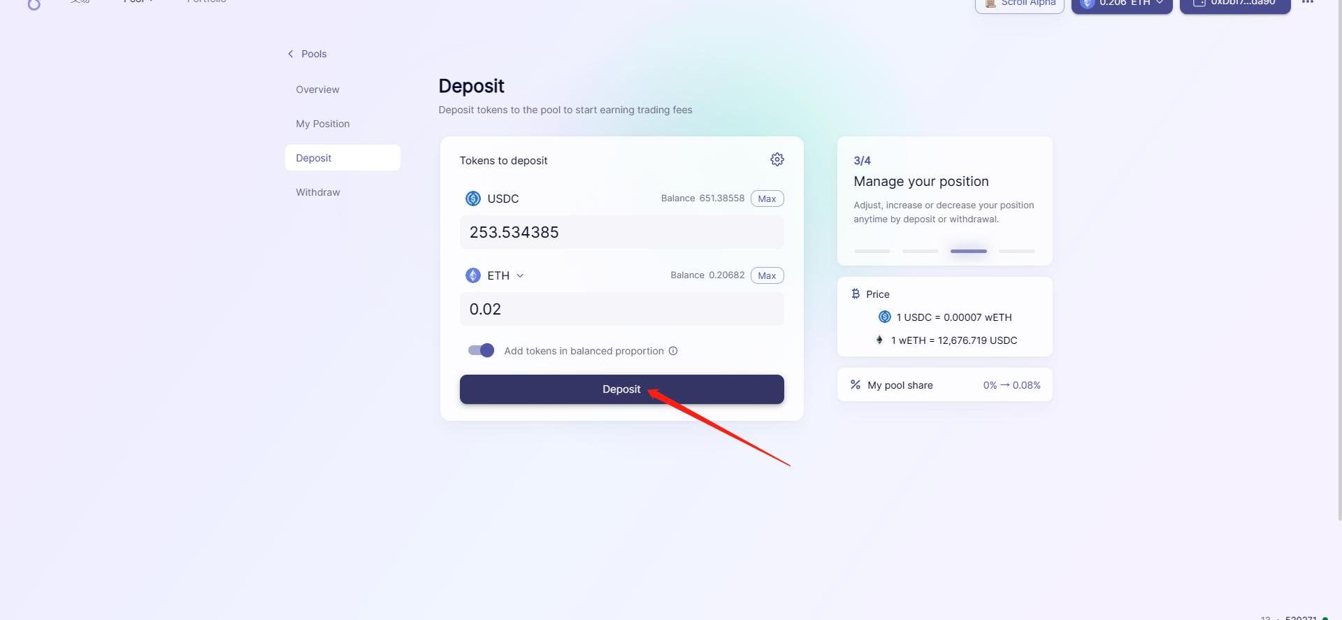 输入USDC的数量,再点击批准USDC,最后点击预览,钱包点击确认这样你的流动性就添加成功了