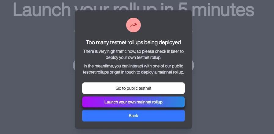 3.不过,或许是由于当前访问人数过多,在点击?LaunchRollup之后,Caldera会提示稍后再试。这时,Caldera也提供了一个已部署的测试网供我们先行试用,点击Gotopublictestnet即可访问。