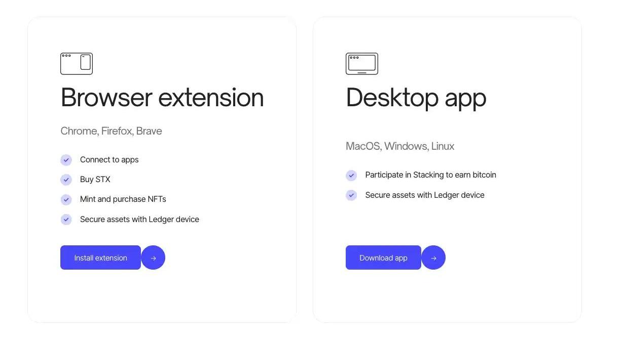 浏览器拓展版本可以连接应用、购买STX、mint和购买NFT、使用Ledger硬钱包。桌面端版本可以参与质押赚取比特币和使用Ledger硬钱包保护资产。