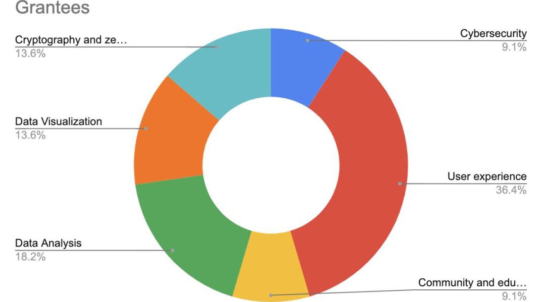 不同类别项目的获奖比例也有所不同,其中,用户体验类项目占比最高,为36.4%,数据分析类项目为18.2%位列第二,密码学与零知识证明、数据可视化类项目各占13.6%,网络安全及社区与教育类项目各占9.1%: