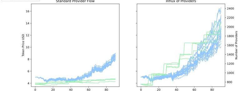 供应商也像代理一样行动,通过风险容忍度和资本进入模拟,以及总网络计算能力的百分比,即提供的“服务量”。他们的激励与用户不同,因为他们更有可能在任何时间步骤卖出代币,以便支付运营成本。供应商评估的市场趋势和宏观趋势与用户相同,受到相似的输入影响。