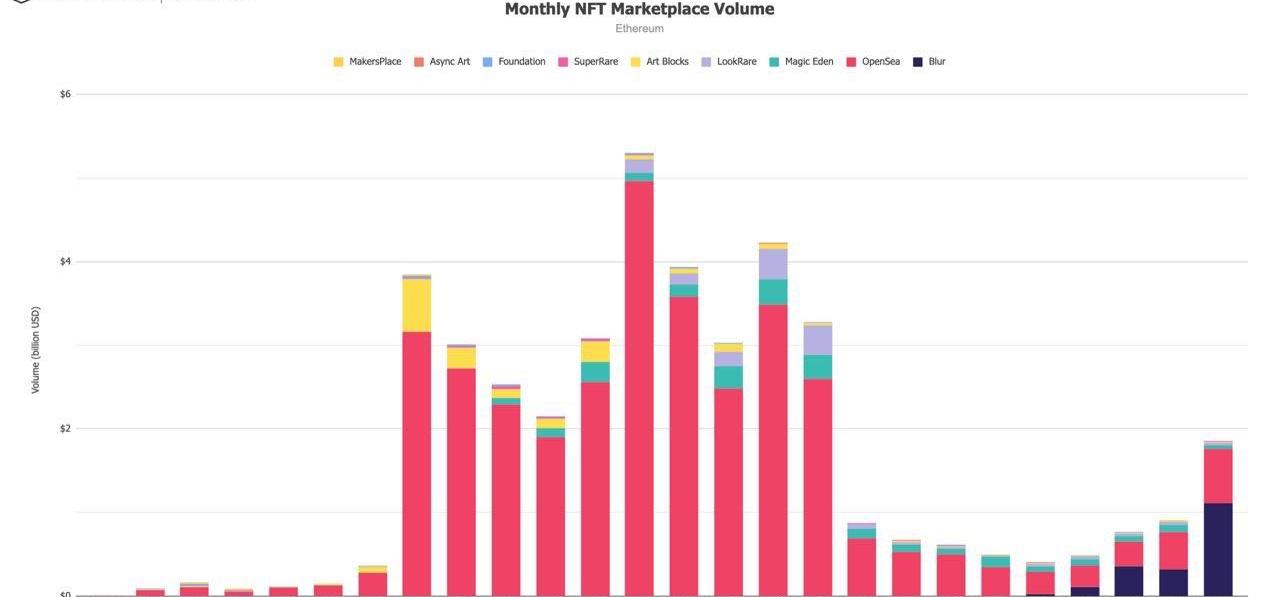 5、二月以太坊链上NFT市场交易额达到了18.6亿美元,涨幅高达103.2%,这种上涨态势主要由NFT市场Blur推动,随着其BLUR代币推出,Blur在交易量等指标上已超越了OpenSea。