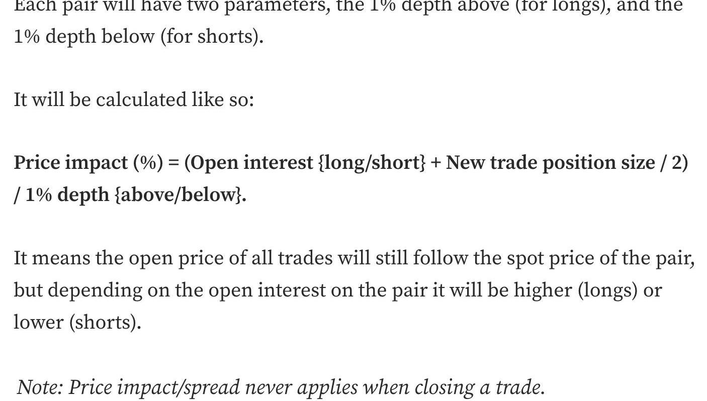 Spread是开仓时需要付出的额外滑点。对于预言机定价而言,其滑点应该根据预言机来源的交易对的深度而动态调整,使得在场外操纵价格的成本始终高于在场内的盈利。所以Spread正相关开仓规模和场内OI影响,而负相关于场外现货深度。公式参见下图