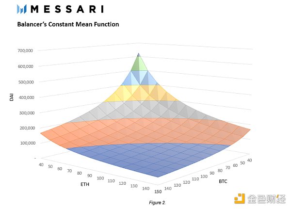 Balancer的AMM一般化了Uniswap的恒定乘积功能,创造了一个被称为 "恒定平均AMM"的变体。这个AMM的核心是价值函数,它强制规定资产池中的资产余额的权重次幂的乘积应始终保持不变。