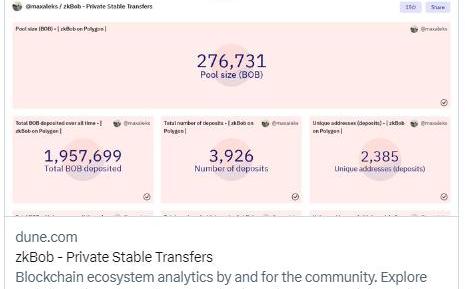 支持Polygon、Optimism、Ethereum,目前仅支持稳定币BOB单币隐私传输,用户DepositBOB,通过ZK获得加密地址,将BOB隐私传输给其他加密地址。提款时,也可提款给其他地址。暂时仅限BOB。交互确认时间稍长,需1分钟左右。