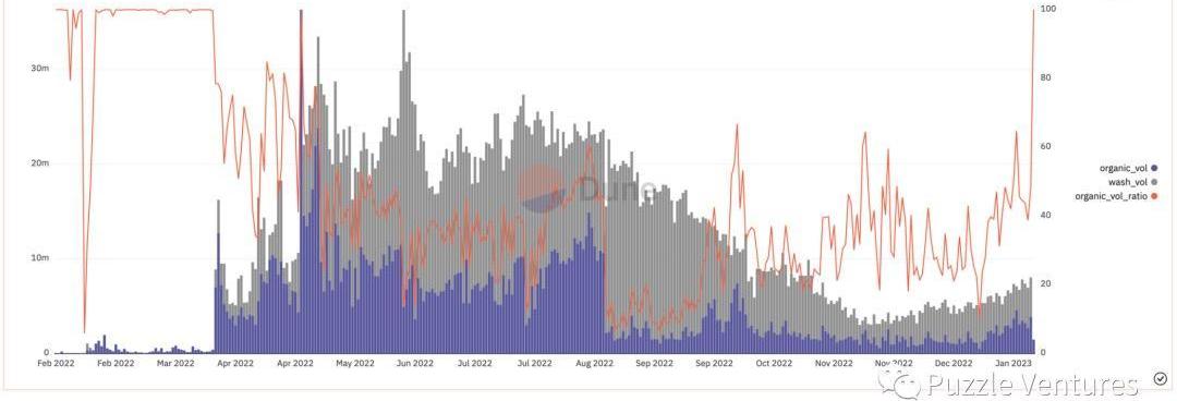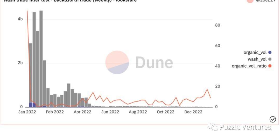 利用第二层溯源过滤器(First-fundedbythesamewallet)对LooksRare市场表现进行过滤,发现在2022年1月后有一定量此类型交易出现,从交易量的角度看,占比低于第一层过滤器滤掉的交易。(Source:?Zoe’sDuneQuery)