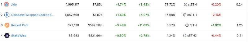 LSD的龙头是Lido。在LSD协议中,有高达30%的质押ETH和超过70%的ETH位于Lido。