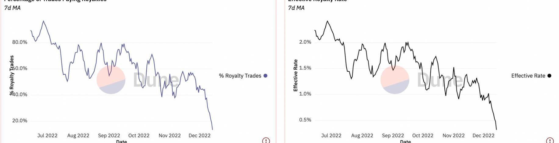虽然目前市场上可以观察到NFT收藏者更加倾向于在无版税NFT市场交易NFT,以在熊市中节省资金并获得尽可能多的收入。版税的支付情况也因此一直在持续下滑。