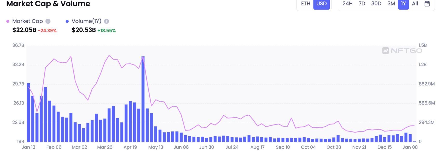 而2022年对于NFT领域来说却是艰难的一年,从年初的Luna暴雷,到年末的FTX倒闭事件,虽然NFT依旧伴随着新项目的诞生和探索,但整体加密生态的低迷也将NFT市场拽入了熊市。