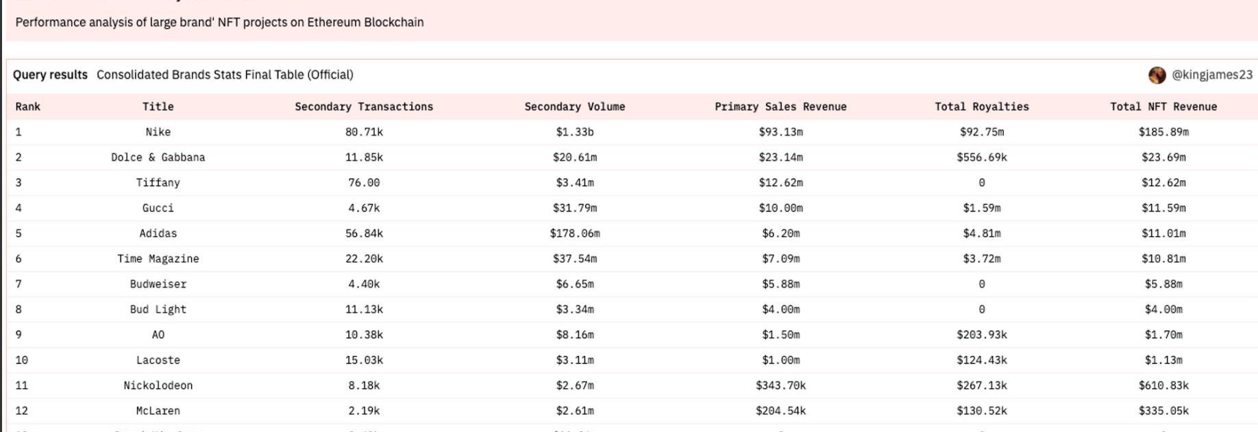 体育运动品牌NIKE旗下增长最快业务就是NFT。DuneAnalytics统计,NIKE在NFT收入最高品牌榜居首位,累计销售额1.86亿美元。