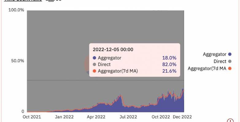 最后再关注一下市场交易金额数据,目前聚合市场交易金额占比为11.7%,与之前的购买量数据相比约有16%的差距。由此我们可以大胆推论——聚合市场大部分交易量的来源是价格较低的NFT,人们会选择在聚合平台上批量购买他们认为有潜力且目前价格较低的产品,而对于蓝筹类的NFT,在没有平台活动的情况下,人们还是会倾向于去Opensea这样的交易平台进行操作,降低风险。
