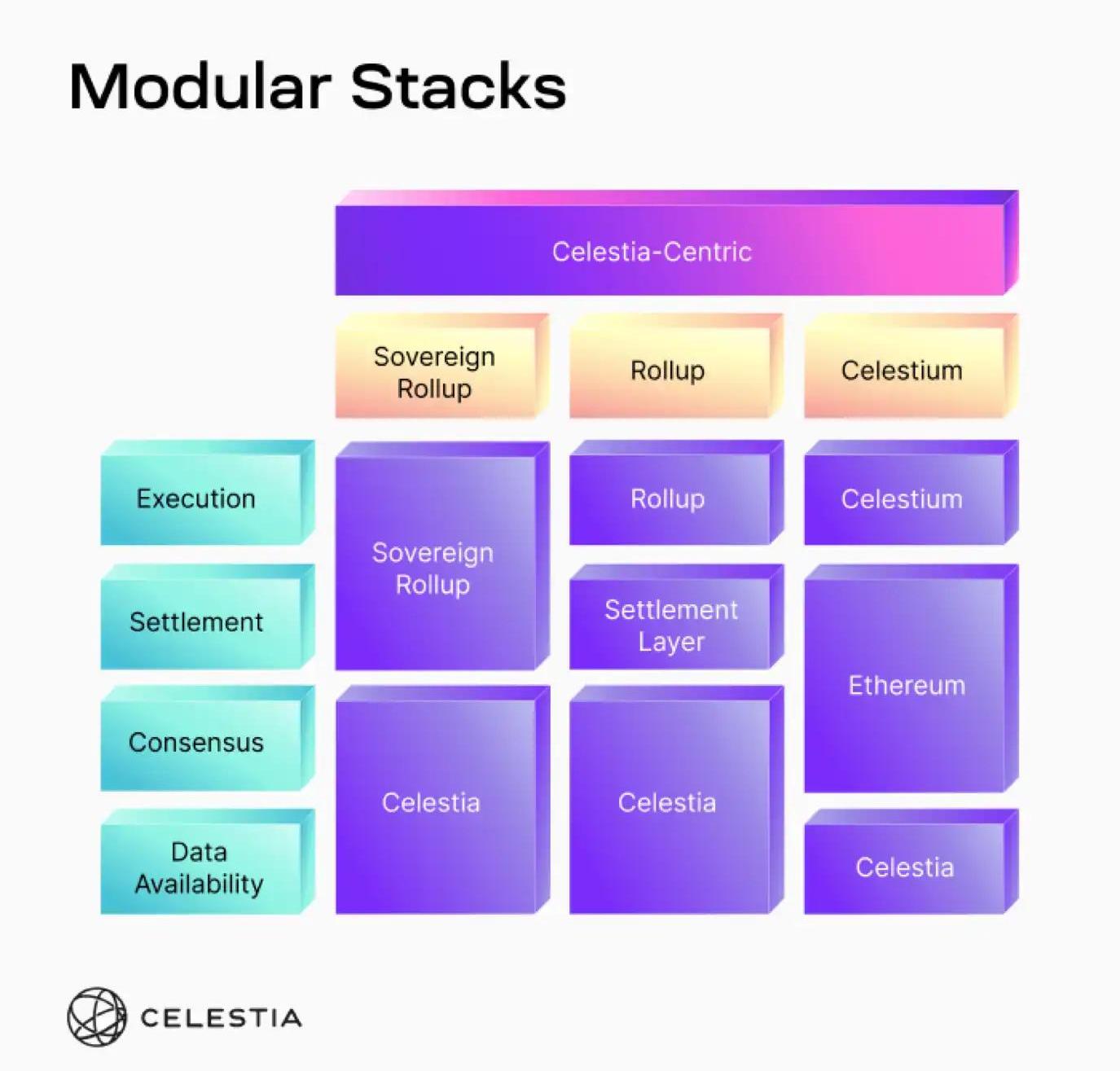 Celestia是一个模块化区块链网络,区块链和所有VM的Rollup可以使用Celestia作为数据可用性层和共识层,如下图,Celestia为模块化扩展提供了不同的解决方案,如「Sovereignrollups、Celestium等」。