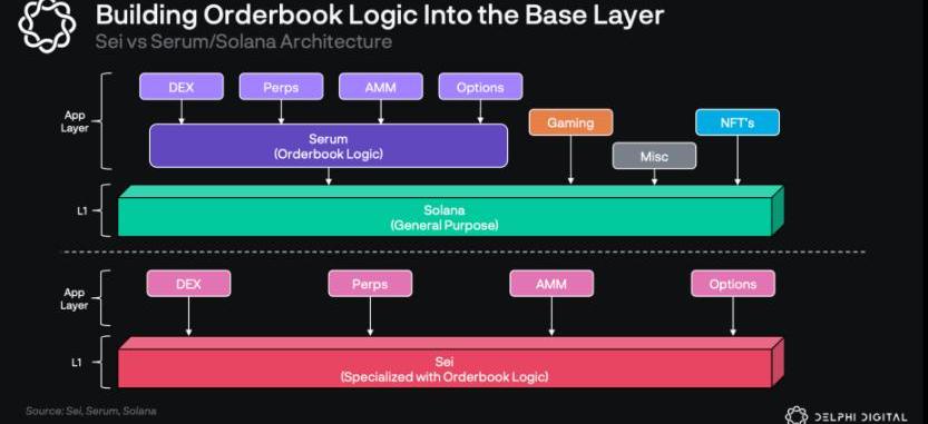 然而这种架构也有一些缺点,最值得注意的是,由于Solana是一个通用链,Serum不断地与其他应用竞争资源。与Serum无关的活动,如游戏和铸造NFT,会导致链上的拥堵,正如我们此前经历过的Solana的几次「停机」。Sei则是选择「削足适履」,将所有非DeFi活动从他们的链上剥离出来。一个简单的解释是,Sei就相当于是Serum推出了自己的Layer1区块链:做出具体的权衡,使基础层为DeFi优化,并给建立在其上的DeFi应用拥有较非DeFi的应用「不公平的优势」。
