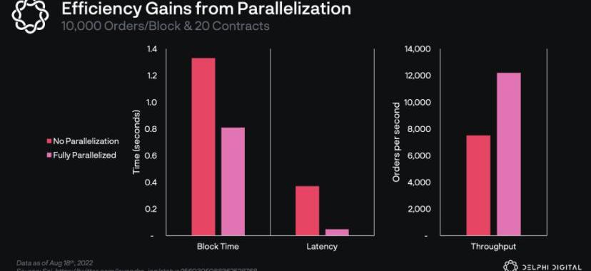 Sei围绕并行化进行了一些负载测试,以观察在出块时间、延迟和吞吐量方面能得到什么样的改进。一般来说,通过并行化的执行,可以将区块时间比按顺序处理减少75-90%,并行的延迟为40-120ms,顺序的延迟为200-1370ms。在拥有1万个订单/区块和20个不同合约的情况下,并行能够将出块时间从1.33s减少到0.81s,延迟从371ms减少到48ms,吞吐量从7500个订单/s到12200个订单/s。在所有的负载水平上都可以看到明显的改进,随着负载量的增加,边际优化程度更大。?