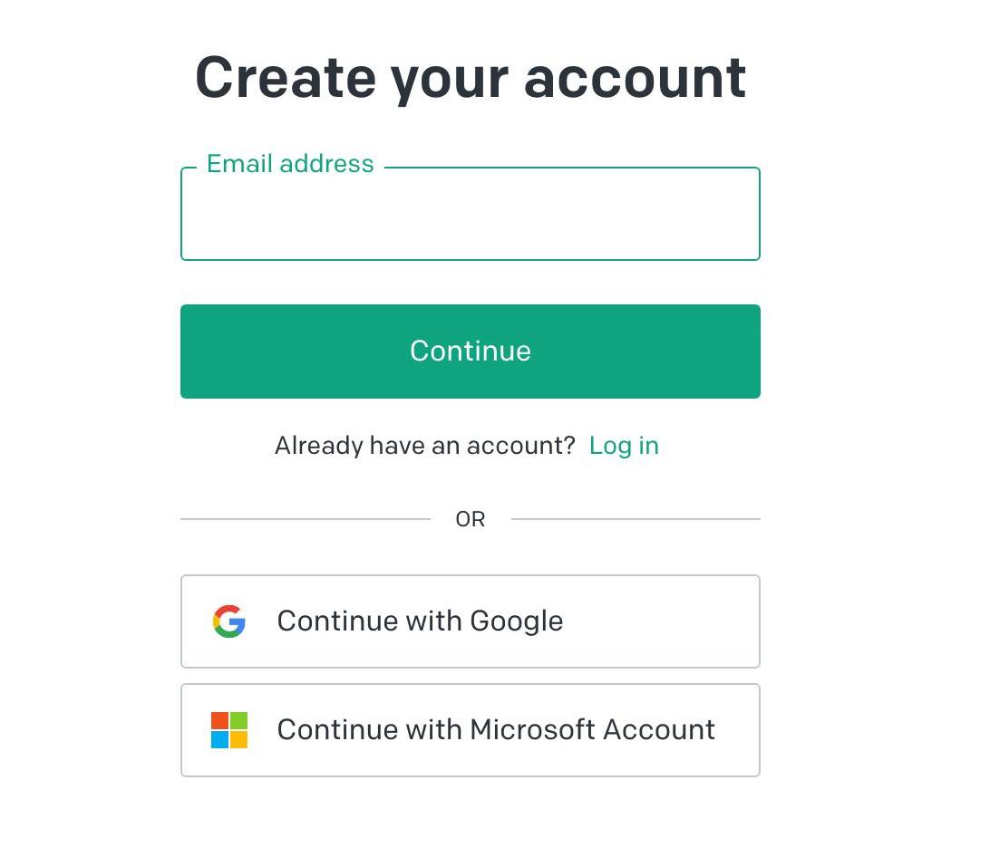 首先是打开ChatGPT的账户注册页面。谷歌注册或者邮箱注册都可以,无所谓,这里用邮箱注册作为例子。