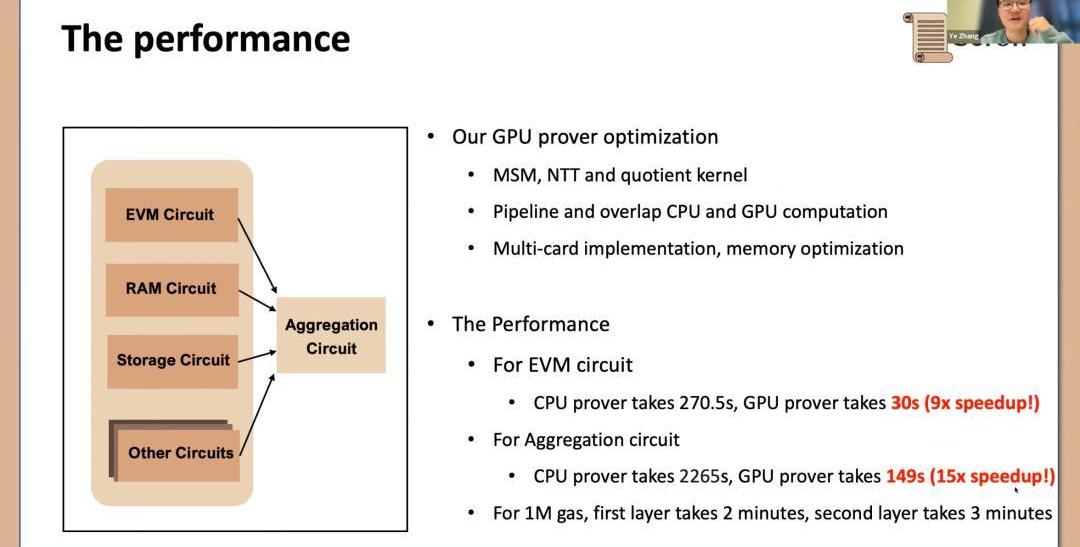 在硬件加速方面,Scroll拥有独有的PipeZK加速方案。对于第一层的EVM电路,加速后的GPU可以提升9倍速度,在30秒内完成证明。对于第二层的聚合电路,加速后的GPU可以提升15倍速度,在约2分半内完成证明。由于Pre-Alpha测试网目前只有10个左右的证明者,实际速度可能会略慢于实验数据。