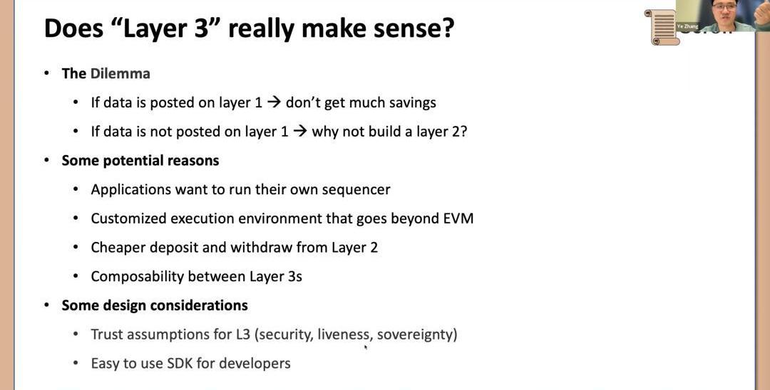 研究的第二个方向,是L3存在的意义。L3最早由StarkNet所提出,但存在争议的点在于,如果数据可用性放在L1上,并不能节省太多的成本,如果数据可用性不放在L1上,大可以在L2实现类似的功能。L3更可能适用于应用的自定义需求,例如独有的排序器,自定义的执行环境,或是更低价的存取款费用,亦或是L3之间所需的可组合性。关于L3的更多探讨,可参考Vitalik:什么样的Layer3是有意义的?