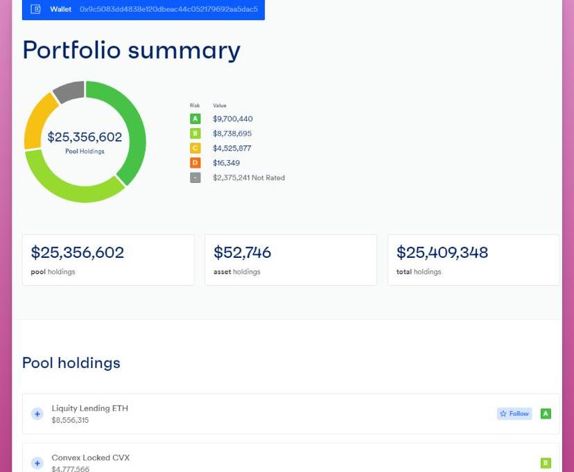 「评价钱包」功能会为你提供当前投资的风险分析。例如,在Tetranode的资产中,就有450万美元的资产是被存入在风险较高的协议中。