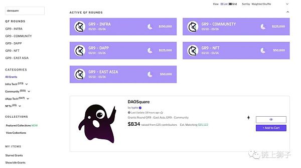 第五步,在https://gitcoin.co/grants/explorer/页面浏览选择你喜欢的项目,或者在左边的搜索框搜索对应项目的名字,点击Add to Cart相当于加入你的购物车,方便下一步捐款。