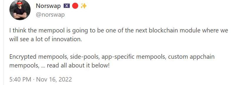 尽管有这些担忧,在MEV保护领域发生的这些创新足够让人惊讶。这篇文章的篇幅就凸显了这个问题有多么重要,可以看到内存池的发展将会是2023年的重要主题之一,尤其是在熊市的低谷期,基础架构是主要创新阵地。