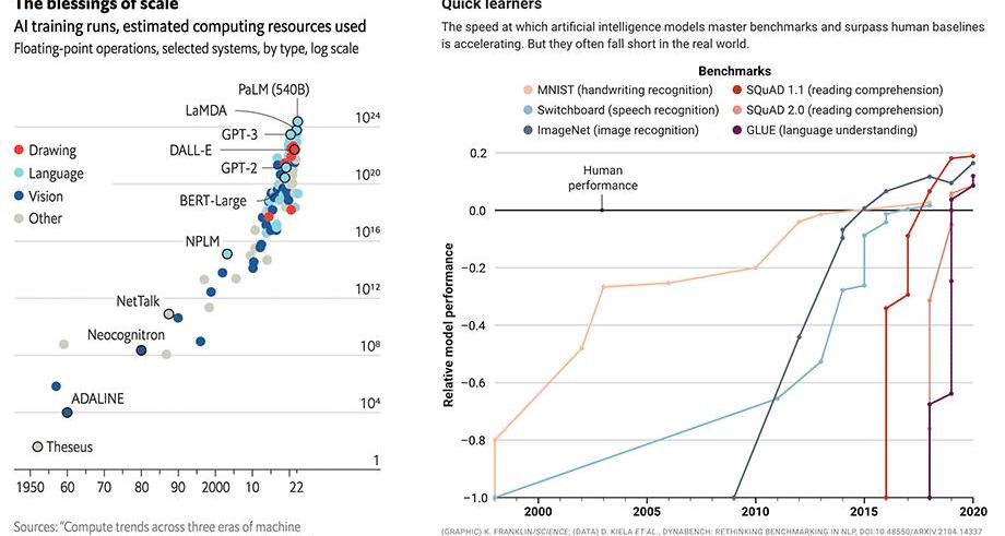 当然,随着模型越来越大,它们开始提供与人类相当的水平能力,然后是超人类的成果。从2015年到2020年,用于训练这些模型的计算量增加了6个数量级,其成果在手写、语音和图像识别、阅读理解和语言理解方面超过了人类性能的基准。OpenAI的GPT-3脱颖而出:该模型的性能不仅比GPT-2有了巨大的飞跃,并且在他们提供的充满吸引力的Twitter演示中也能看出,不管是在代码生成还是冷笑话写作等任务上,它的表现都令人大开眼界。