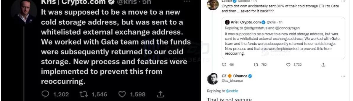 据BlockBeats报道,11月3日,一些社区用户发现Crypto.com平台相关地址曾于10月份将约28.5万枚ETH转入交易平台Gate地址,数天后Gate将其退回Crypto.com另一地址,但这两个地址随后均出现在Crypto.com公布的离线储存用户资产的冷钱包地址名单中。对此,其首席执行官KrisMarszalek当日于推特发文表示,此前平台冷钱包的异动,是因为团队几个月前不小心将4亿美元的ETH错误地发送到了Gate.io交易所的钱包地址中,并表示自己与Gate团队合作,资金已被退回。
