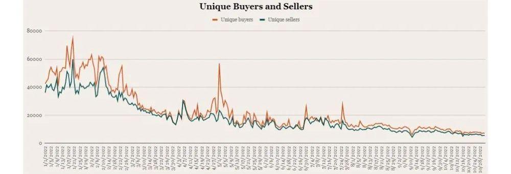 NFT市场活动的另一个指标是买家和卖家的独特数量。虽然交易双方的参与者数量一直在减少,但最近几个月一直持平。22年第1季度,买卖双方之间的正价差显示了对NFT价格的更明显支持。下半年严峻的宏观环境导致更多用户出售NFT,这一缺口缩小,从而增加了价格压力。过去几周,买家数量比卖家数量少但持续增加,自8月以来,总体活动基本保持稳定。