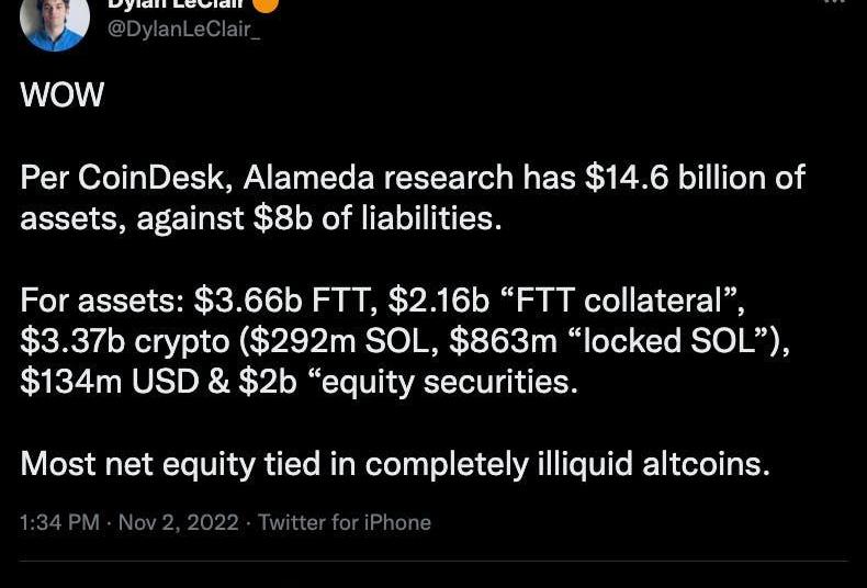 不到一周前,即**11月2日**,CoinDesk爆料,声称获得了AlamedaResearch的资产负债表。它已经隐约表示对冲基金Alameda和交易所FTX之间已经开始出现问题。