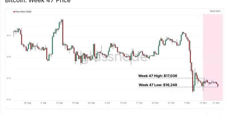 FTX?风波对主流币及整体加密市场的冲击仍在持续,我们想探讨链上数据的发展趋势,评估近期市场疲软是否动摇了比特币持有者的信心。本周市场继续盘整,但从本周初的?17036?美元高位回落至?16248?美元,为本轮周期的最低收盘价之一。