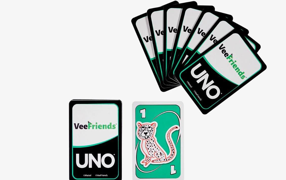美泰的VeeFriendsUNO牌组具有VeeFriends的标志性角色和NFT特色(右图是对应的史诗稀有CharmingCheetah)。