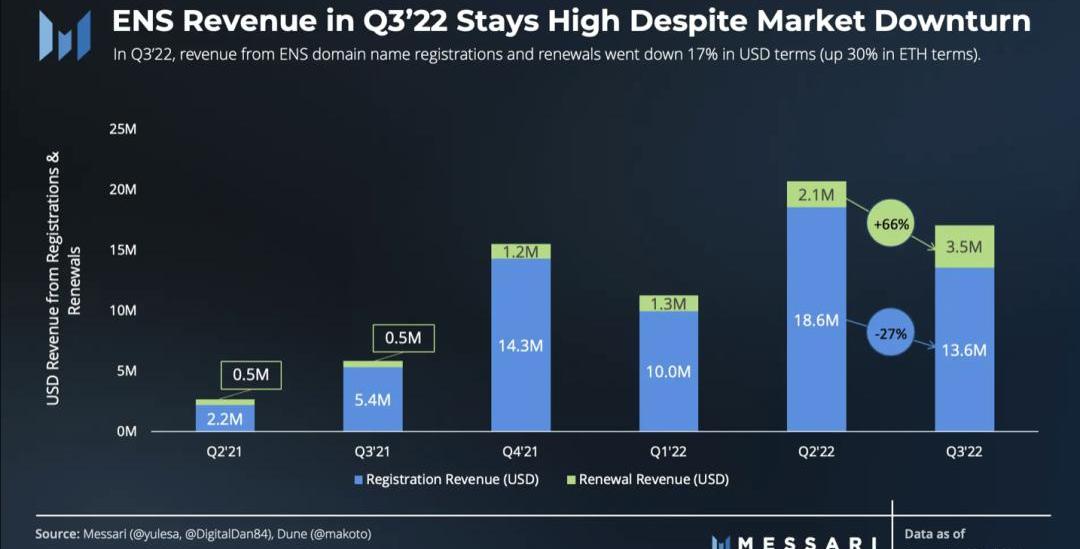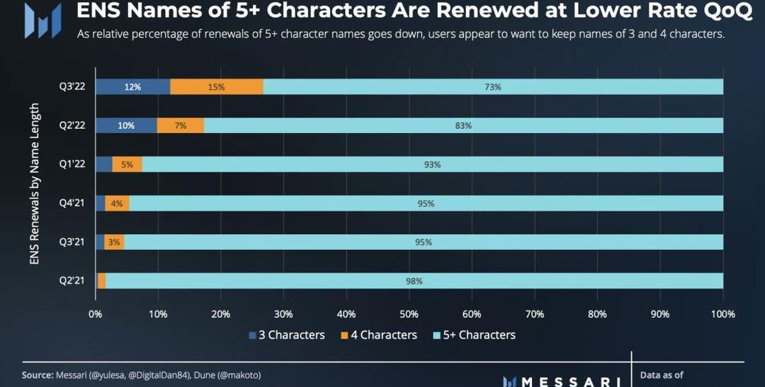 在22年第二季度,人们争先恐后地铸造3和4个字符名称和短词。随着这些类型的ENS名称数量的减少,创造昂贵名称的机会也减少了。由于可以注册这些昂贵的名称,相对于5个以上的字符名称,3和4个字符名称的注册收入份额在22年第三季度显著下降。