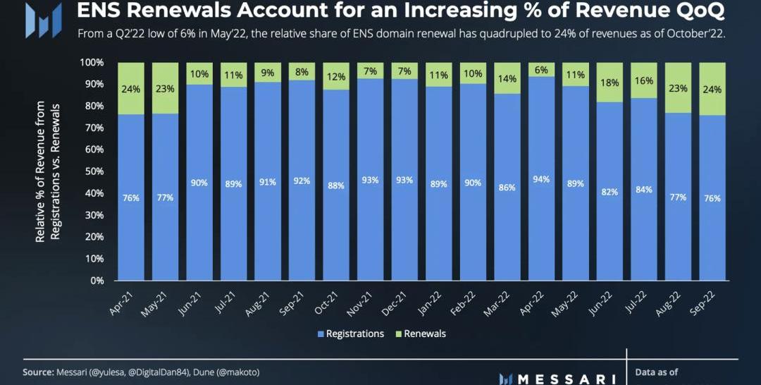 在过去两个季度中,ENS域名续订已占总收入的很大比例。从5月份的22年第二季度低点6%开始,ENS域名续订的相对份额已翻了两番,截至10月份占收入的24%。