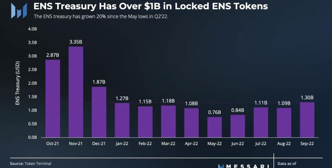 自22年第二季度的5月低点以来,ENS资金增长了20%,这反映了ENS价格在同一时期的增长。国库总共持有1.85亿美元的未锁定资金以及另外10.7亿美元的锁定ENS代币。