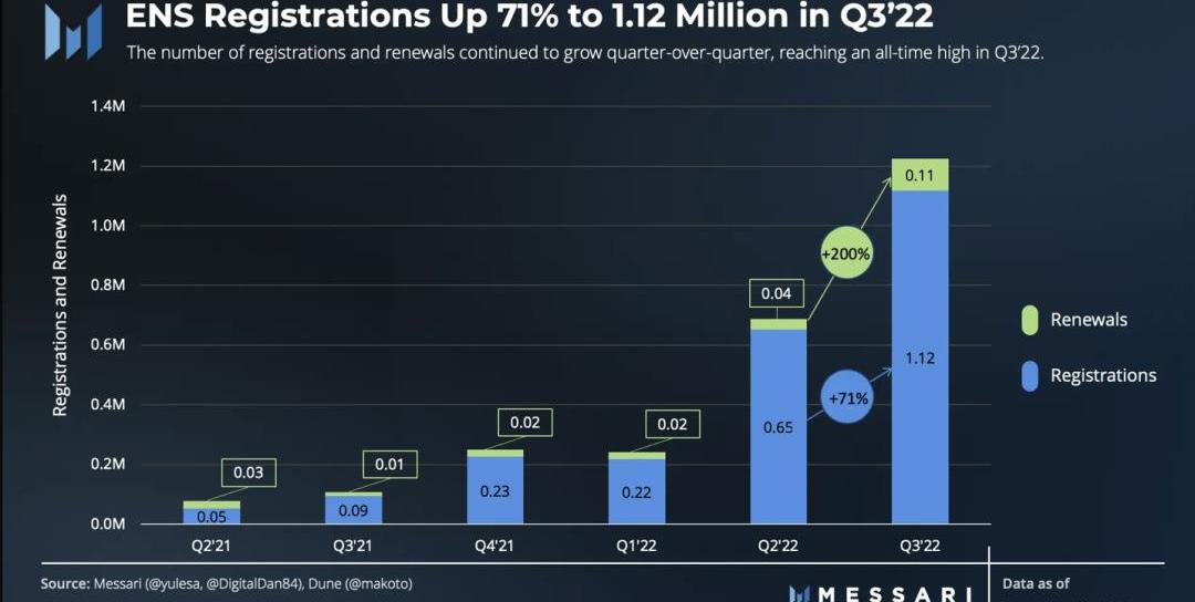 在用户体验方面,ENS为整个Web3领域迈出了重要的一步。ENS提供了一个用户友好的解决方案,将区块链地址映射到易于复制的域名。任何人都可以注册并拥有多年的ENS域名。ENS?域名注册数量在22年第三季度创下历史新高。同时,续订量环比增长了3倍。鉴于许多ENS名称将在未来几个月内续订,注册和续订是否会继续增长还有待观察。
