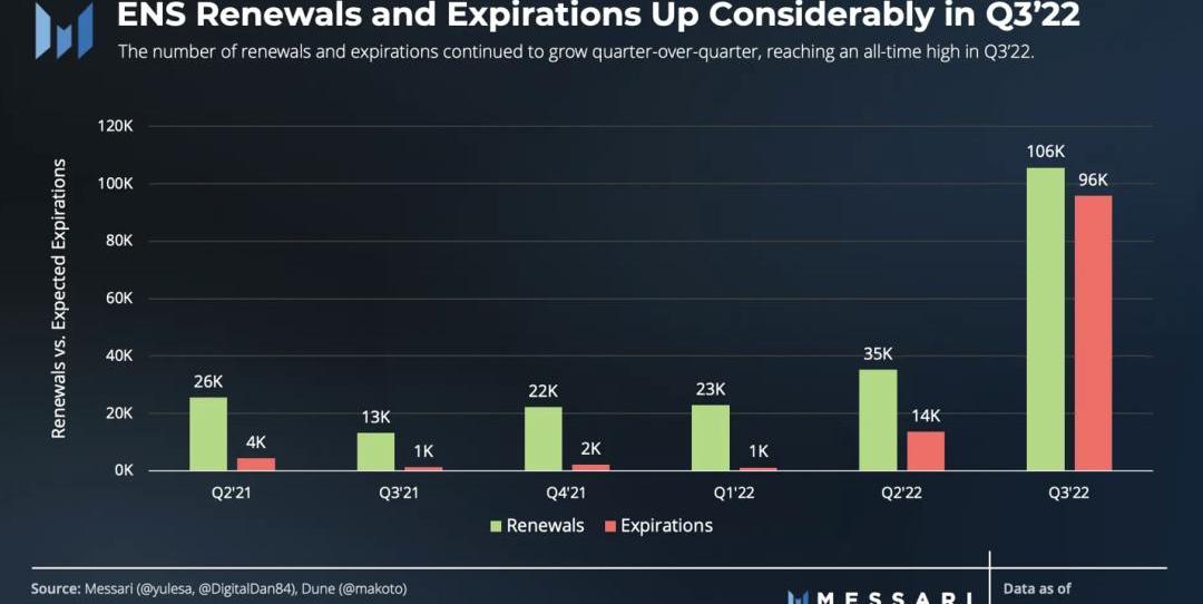ENS在22年第三季度达到112万个域名注册的历史新高,环比增长71%。同时,ENS域名续订量从22年第二季度的35,135次增长到22年第三季度的105,546次,增长了3倍。必须在发生续订时的预期到期时间的背景下理解续订环比的显著增加。
