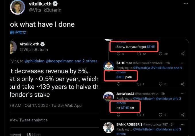 由于the这个词在英文语境里出现的过于频繁,当V神的另一个帖子话语里不可避免地带了the时,评论区里俨然充满了快活的气氛:所有的评论都指向了THE代币。