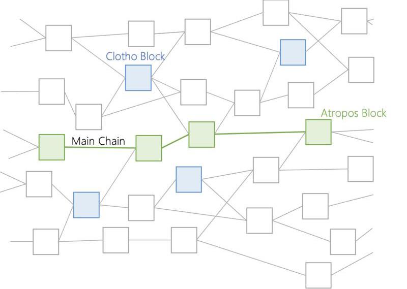 根据彼此之间的通信信息,Clotho?块之间达成共识来创建另一个事件块,称之为“Atropos”块。每个?Clotho?块在创建时都有一个特定的时间戳。如果所有节点中至少?2/3?的节点时间相同,则?Clotho?块将成为?Atropos?块。这些?Atropos?块串联在一起构成“主链”。主链可以看作是?DAG?结构中的区块链。每个?Atropos?块都与其他?Atropos?块相连接,共享从?Clothos?块收集来的信息,而?Clothos?块的信息又来自所有其他事件块。