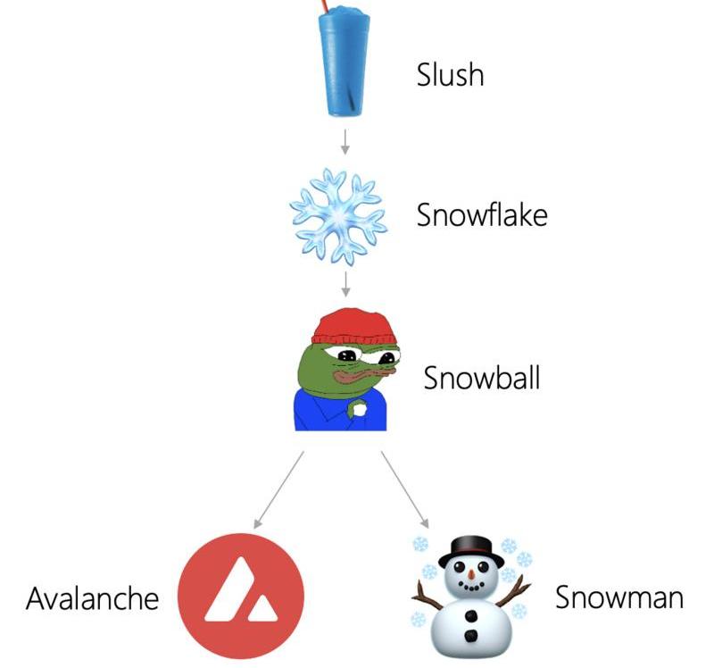 Avalanche?能够整合?Slush、Snowflake?和?Snowball?并将它们调整为线性链。这样做是为了与?Avalanche?共识并行的?Snowman?共识,这两者完全不同。不同于?Avalanche?的?UTXO?模型,Snowman?共识是基于账户的。Snowman?共识用于?Avalanche?网络的平台链和合约链。该协议原理与上述相同,但每个顶点只有一个父节点而不是多个父节点。因此所有顶点形成全序。这也使整体结构呈现为区块链,而不是?DAG。这对于需要知道交易先后顺序的应用程序来说非常有用,并且?Snowman?共识还支持智能合约。