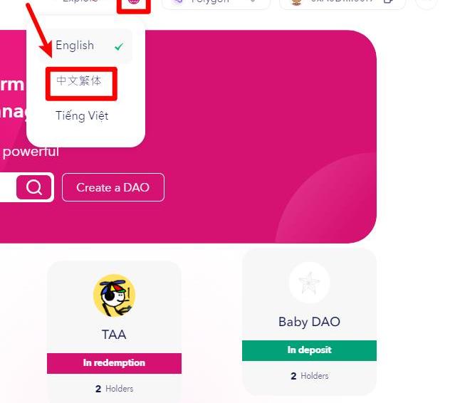 点击网页上方的,然后点击,找到你刚刚创立的DAO,点击它。